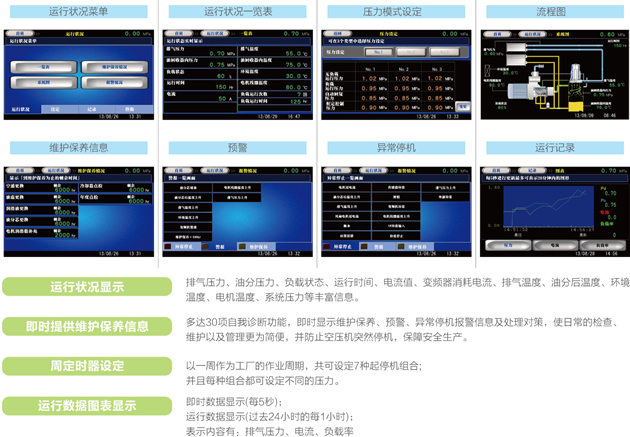 采用新型的LCD觸摸式液晶顯示器,操作更加省力、省時(shí)。![]() 標(biāo)配臺(tái)控功能 不需要額外配置臺(tái)數(shù)控制器,就可實(shí)現(xiàn)*大6臺(tái)空壓機(jī)的聯(lián)控。 標(biāo)配Modbus協(xié)議,無(wú)需另置Modbus模塊,就可實(shí)現(xiàn)Modbus通訊。 通過Modbus通訊,可遠(yuǎn)程掌握機(jī)器實(shí)時(shí)運(yùn)行狀況,使運(yùn)行管理省事省力并能在異常。 標(biāo)配Modbus協(xié)議 標(biāo)配Modbus協(xié)議,無(wú)需另置Modbus模塊,就可實(shí)現(xiàn)Modbus通訊。 通過Modbus通訊,可遠(yuǎn)程掌握機(jī)器實(shí)時(shí)運(yùn)行狀況,使運(yùn)行管理省事。 省力并能在異常發(fā)生時(shí)迅速采取對(duì)應(yīng)措施。 ![]() 標(biāo)配USB數(shù)據(jù)下載功能 可儲(chǔ)蓄運(yùn)行狀況的詳細(xì)數(shù)據(jù)。 可讀取故障發(fā)生時(shí)事前、事后的數(shù)據(jù)。 無(wú)安裝測(cè)量?jī)x器就可得到節(jié)能診斷數(shù)據(jù)。 過電流保護(hù)功能 當(dāng)變頻器檢查出過電流時(shí)、主機(jī)轉(zhuǎn)速自動(dòng)下降、 從而防止了異常停止、并可繼續(xù)提供空氣。 其他標(biāo)配功能 ![]() |